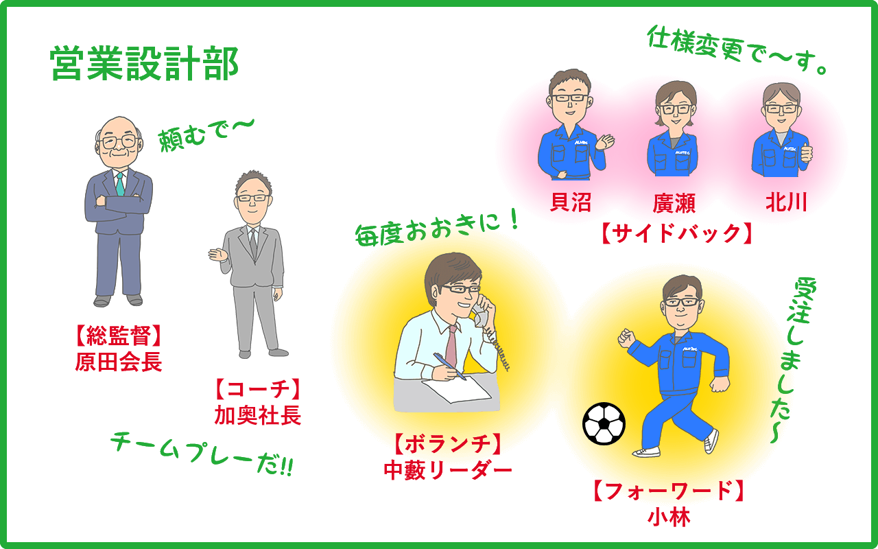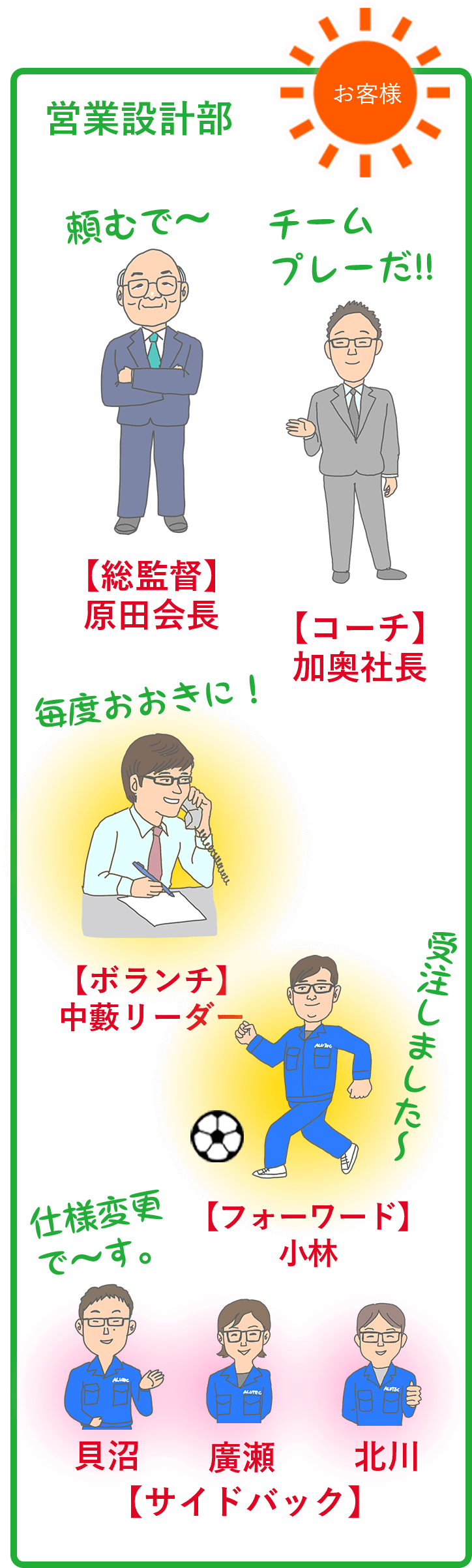 スタートは本社、営業設計部。原田総監督のもと、加奥コーチ率いる営業設計部の面々がスタンバイしています。引き合い発生、提案、受注、工場発注までの流れを紹介します。