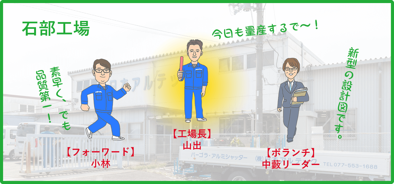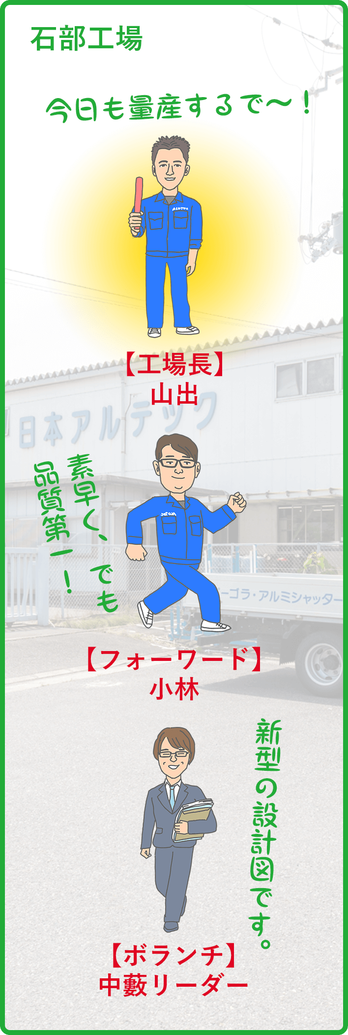 石部工場には毎日ハウスメーカーから今日の量産内容の指示が入ります。山出所長は、仕様変更が生じると本社に設計のリクエストをします。中藪リーダーと小林が設計図を持って届けに行きます。