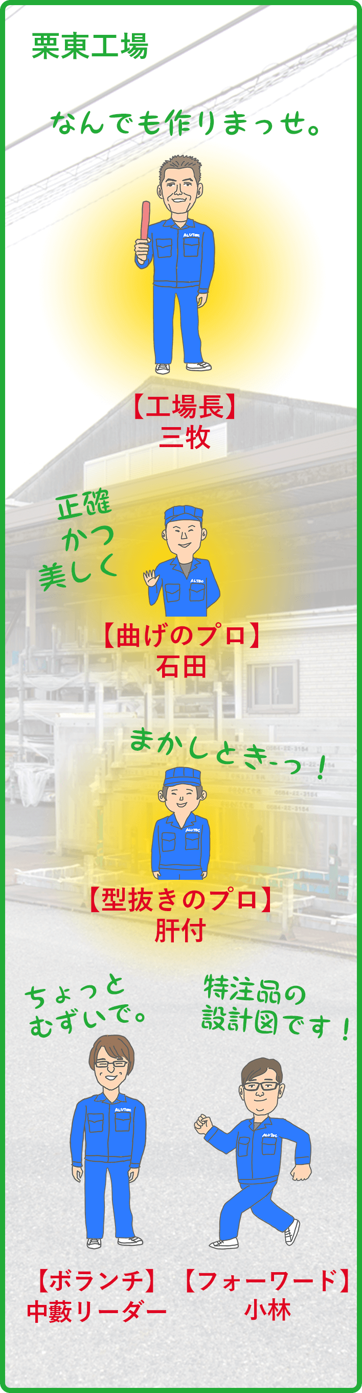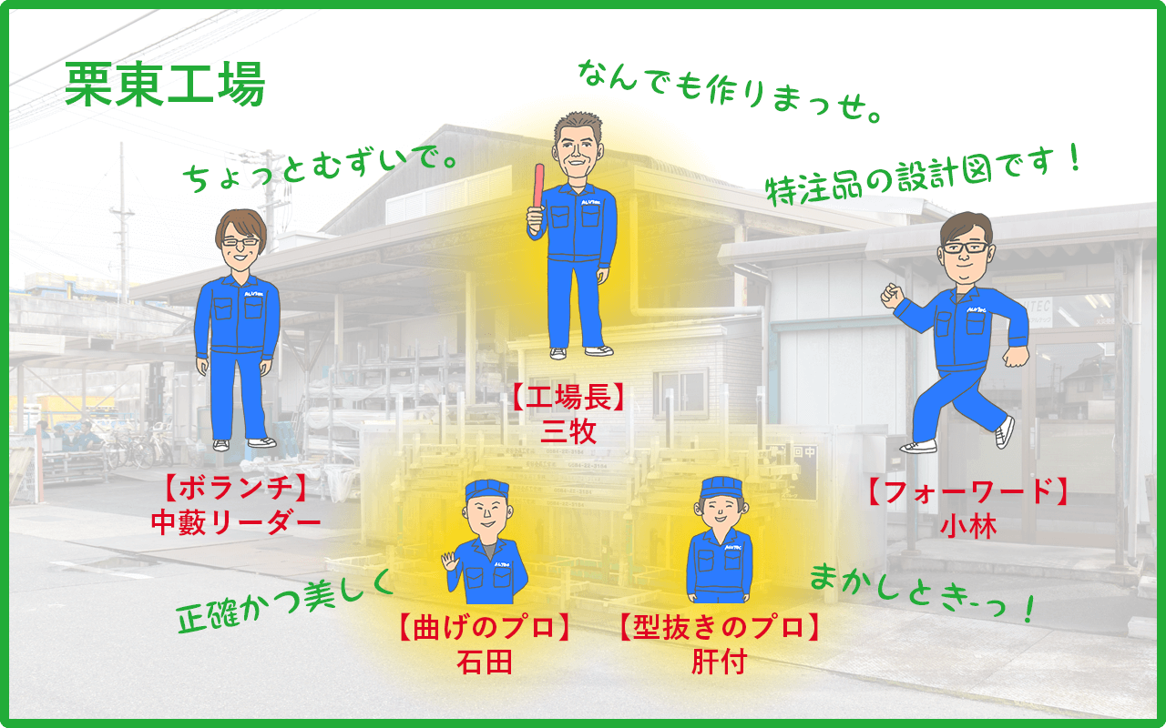栗東工場では、ハウスメーカーや施主様からのオーダーいただく特注品を製造しています。中藪ら営業設計部で仕様を固め、デザインした設計図に沿って、三牧工場長率いる加工のプロが製造します。