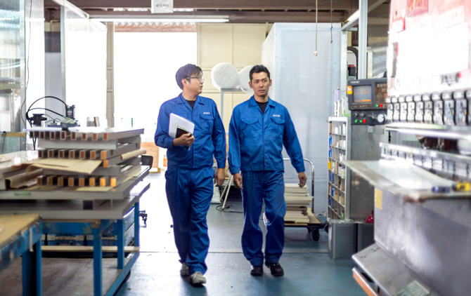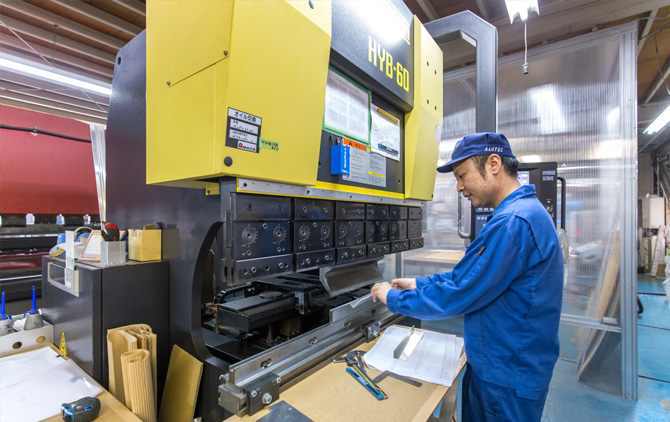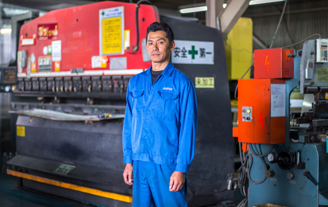 建材事業部のエキスパートのひとりで、「曲げのプロ」。アルミなど薄い板金素材を曲げるプレスブレーキと呼ばれるベンダーを駆使し、タレパンで抜いた板を正確に曲げる。