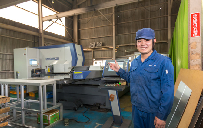 建材事業部のホープ。タレットパンチングプレスを操る「型抜きのプロ」。通称タレパンと呼ばれるこのマシンは、形状の異なる多数の金型を用い、NC制御により板を打ち抜き、目的の展開形状を得る。